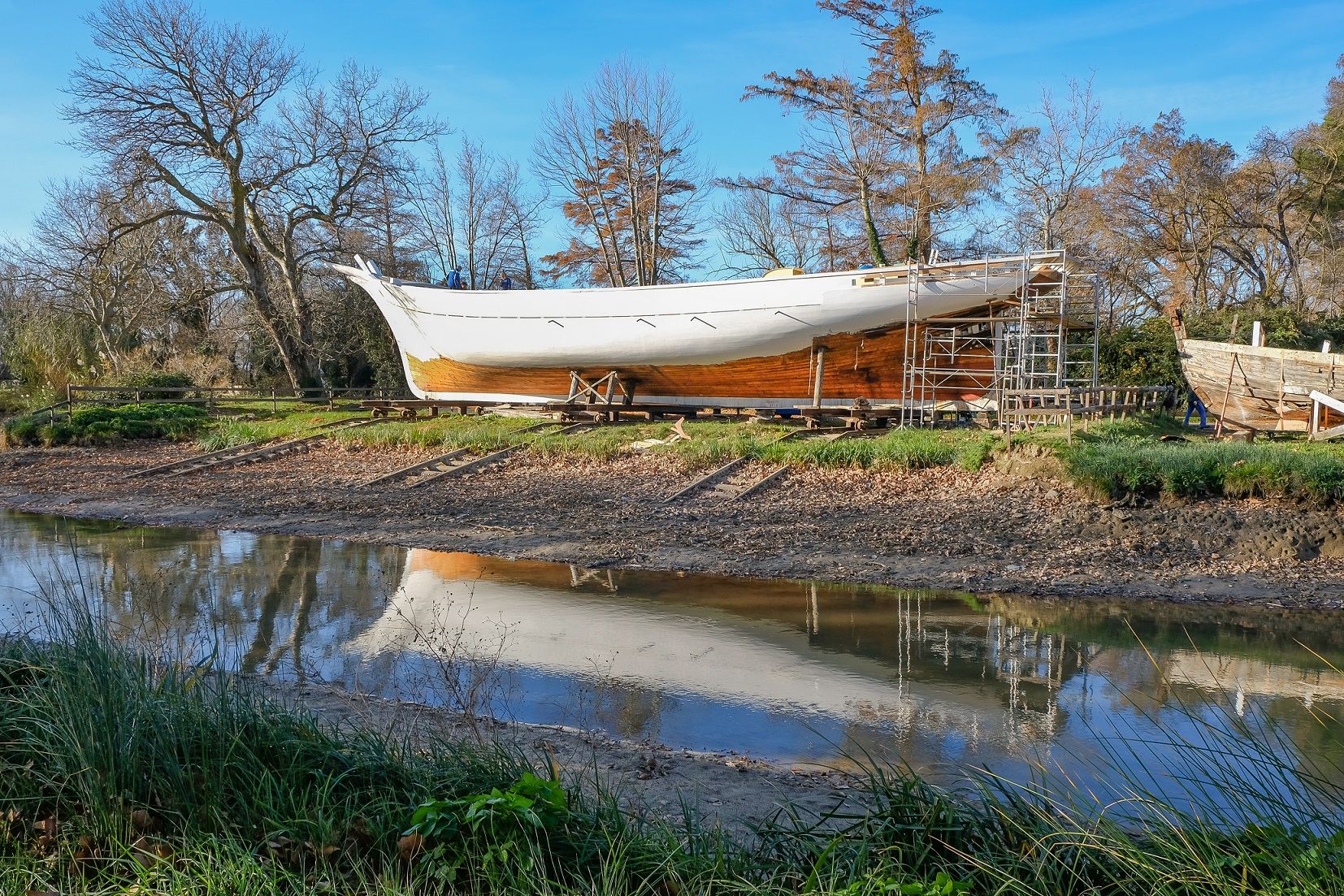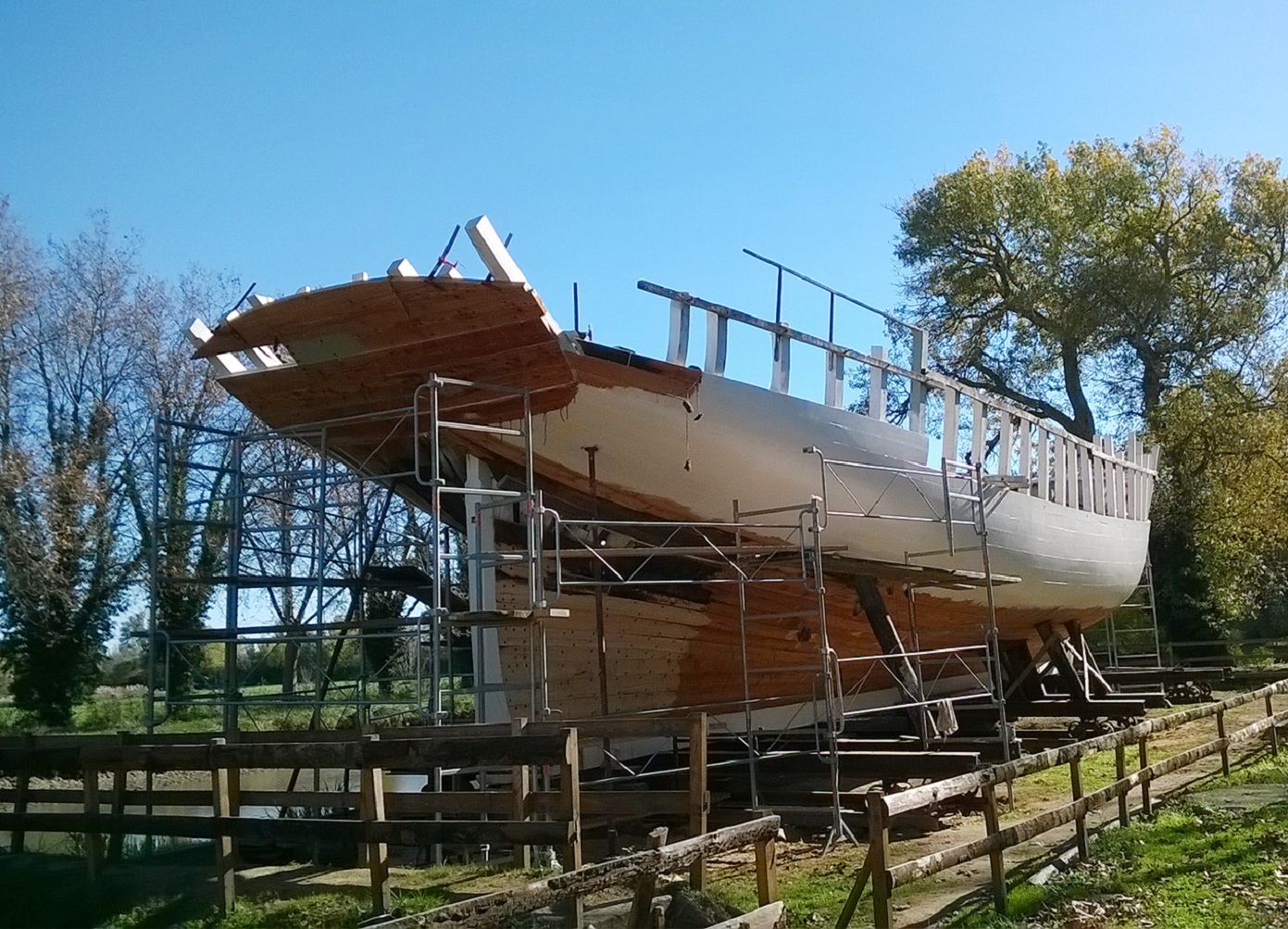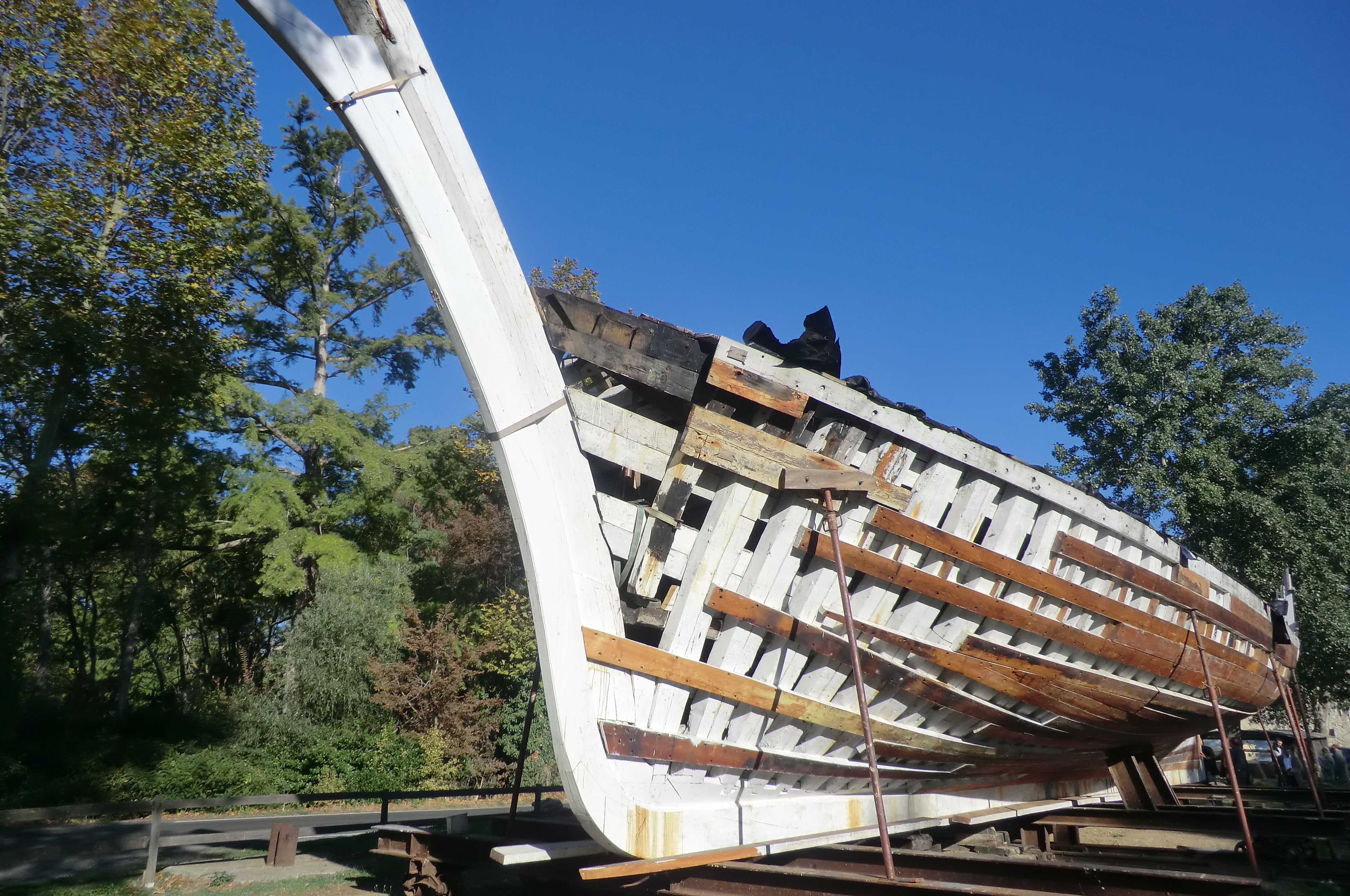 La majorité des bordés sont déposés et l'on peut voir la goélette avec des couleurs d'automne, habillée de quelques nouveaux bordés en mélèze.