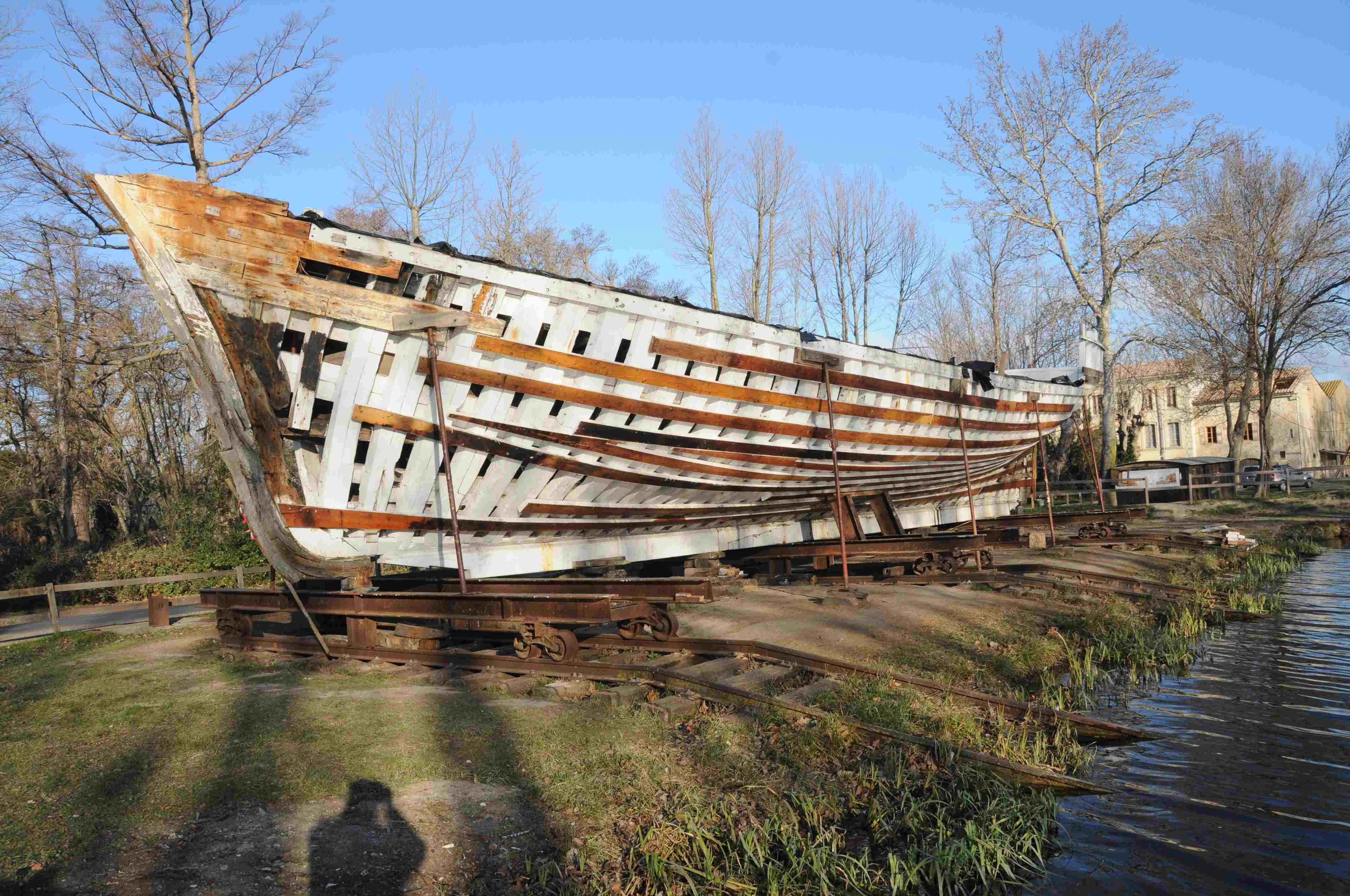 A Mandirac sur le chantier du CPIE de la Narbonnaise, les travaux ont bien avancé avec la réfection des membrures sur tribord, la pause des bauquières et des barrots de pont.