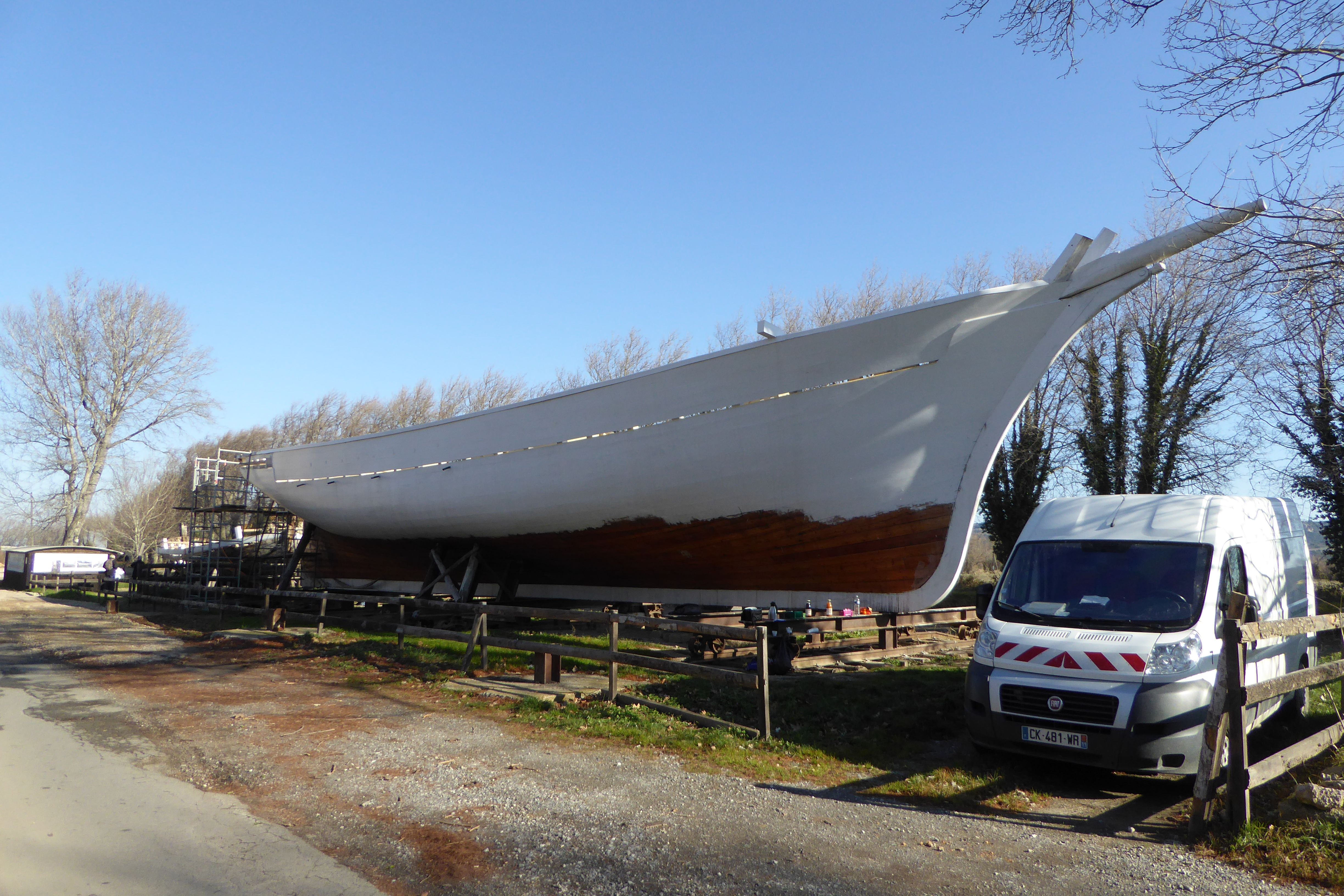 Le tableau arrière est déposé et la quille a été remplacée par deux nouvelles pièces reliées par un trait de jupiter. Pour cela il a fallu monter avec des crics le bateau de 5 cm (en février), apporter les deux pièces depuis l'atelier et creuser dans le sol pour enfiler les boulons galvanisés faits sur mesure. La mise en place de la quille, donne une nouvelle silhouette à la coque. Elle repose maintenant sur un long trait blanc qui attend à ses extrémités deux courbes remarquables, le talon et le brion.